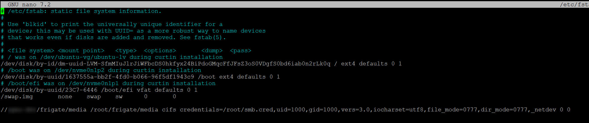 //IPADDRESS/frigate/media /root/frigate/media cifs credentials=/root/.smb.cred,uid=1000,gid=1000,vers=3.0,iocharset=utf8,file_mode=0777,dir_mode=0777,_netdev 0 0
